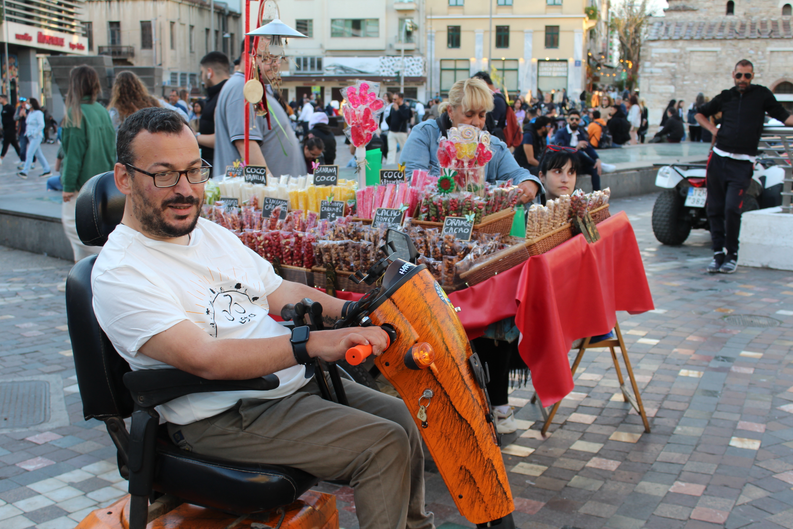 Ο Φώτης είναι παιδί διαμάντι και είναι συνώνυμος με την πόλη μας. Φωτεινός όπως και το όνομά του και ΠΑΝΤΑ χαμογελαστός. Με το χαρακτηριστικό του πολύχρωμο στυλ, μας κάνει μαθήματα στυλ, μοιράζοντας συνεχόμενα αγκαλιές, φιλιά και απόψεις ζωής απλόχερα. Μία συζήτηση μαζί του μόνο πιο μπροστά μπορεί να σε πάει σε ανθρώπινο, αλλά και σε κάθε επίπεδο. Το έχει φιλοσοφήσει το πράγμα που λέμε! Ζει στα Κάτω Πατήσια, αλλά γνωρίζει και την τελευταία γωνιά της Αθήνας, αφού του αρέσουν οι βόλτες και έχει φίλους που τον αγαπάνε παντού. Με τον Φώτη έχουμε περάσει καύσωνες και κρύα στην Ανδριανού μιλώντας ώρες ατελείωτες για τα καθημερινά μας προβλήματα, τα προσωπικά μας και τα ευτράπελα της ζωής γενικότερα. Τα ταιριάζουμε! Μπορείς να μοιραστείς εύκολα και αβίαστα, γιατί στο εμπνέει από το πρώτο λεπτό. Την περίοδο που ασχολούταν με κάθε λογής χειροτεχνίες, από ανακυκλωμένα υλικά, κοσμήματα και κάθε είδους σκουλαρίκια από καπάκια αναψυκτικών, χάρτινες θήκες καπνού μέχρι και χειροποίητες θήκες για αναπτήρες, (έφτιαχνε και φτιάχνει), για κάποια χρόνια που δούλευε στο Μοναστηράκι.